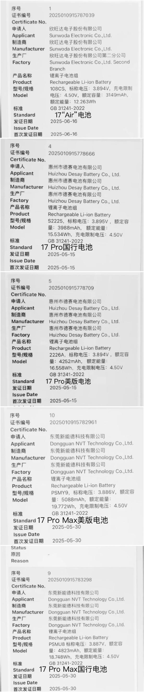 iPhone 17 Pro:国行版电池容量为3988mAh,美版为4252mAh;