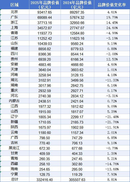 北京以9.3万亿元品牌价值居首,粤浙沪增幅均超10%
