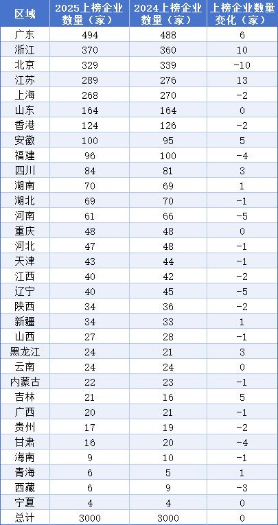 江苏上榜企业数增长最多北京持续下滑