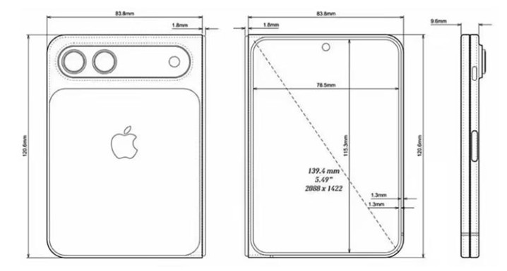 详细来看,iPhone折叠屏手机采用横向内折 ,外屏尺寸为5.5英寸,分辨率为2088×1422,像素PPI达到了460,可谓是十分小巧了;内屏尺寸增大到7.8英寸,其屏幕比例为4:3,理论上这种比例其实更加适合阅读,分辨率是2713×1920,预计内屏还会采用屏下摄像头技术来达到真全面屏的效果。机身尺寸方面,iPhone折叠屏手机在折叠状态下厚度为16.8毫米、展开后为7.2毫米,说实话这个厚度真的不算薄,甚至还有些厚重。